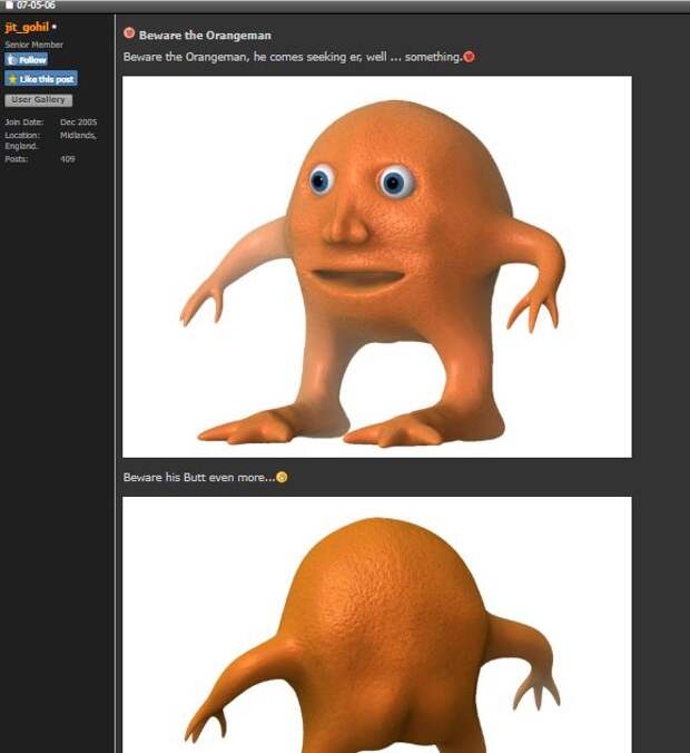 5 июля 2006 года пользователь под ником jit_gohil создал тему под названием «Beware the Orangeman» («Остерегайтесь Оранжмена») на форуме для обсуждения инструмента для компьютерного 3D-моделирования «ZBrush Central».