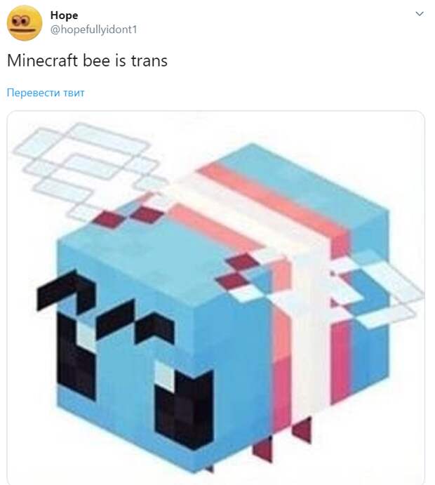 Так, один из пользователей перекрасил пчелу в расцветку трансгендерного флага. И написал твит: Minecraft bee is trans (Пчелы в Майнкрафте — трансы). Твит Twitter