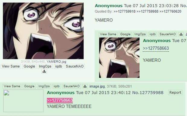 7 июля 2015 года пост с изображением персонажа из аниме «Code Geass» вместе с текстом «YAMERO» появился на 4chan в доске /a/ (аниме).