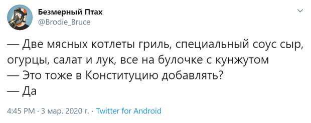 Некоторые идут дальше и свое несогласие с поправками выражают в ироничной форме: шутят, какого именно бога добавят в главный закон, предлагают вписать рецепты своих любимых блюд.