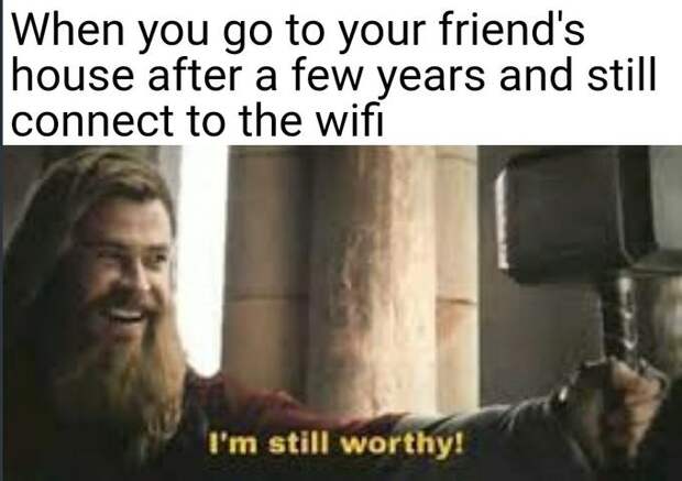 Например, про того же Тора, в связи с его негероическим видом.14 мая 2019 года на Reddit и других западных сайтах начали появляться новые мемы про Тора. На этот раз за основу взяли эпизод в Асгарде. После встречи с матерью Тор призывает свой молот Мьёльнир. Он возвращается, и это радует супергероя. Он произносит фразу I’m still worthy («Я все еще достоин»).